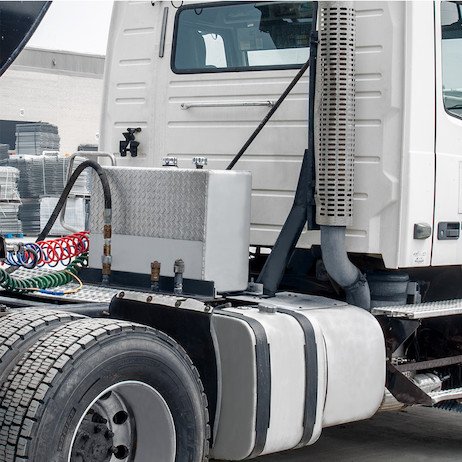 - Upright design fits conveniently behind truck cab.