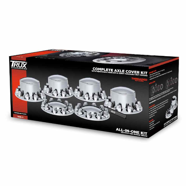 | Product Description | Chrome ABS Plastic, Complete Axle Cover Kit with Removable Hubcaps & 33mm Threaded Nut Covers – Dome Hubcaps |